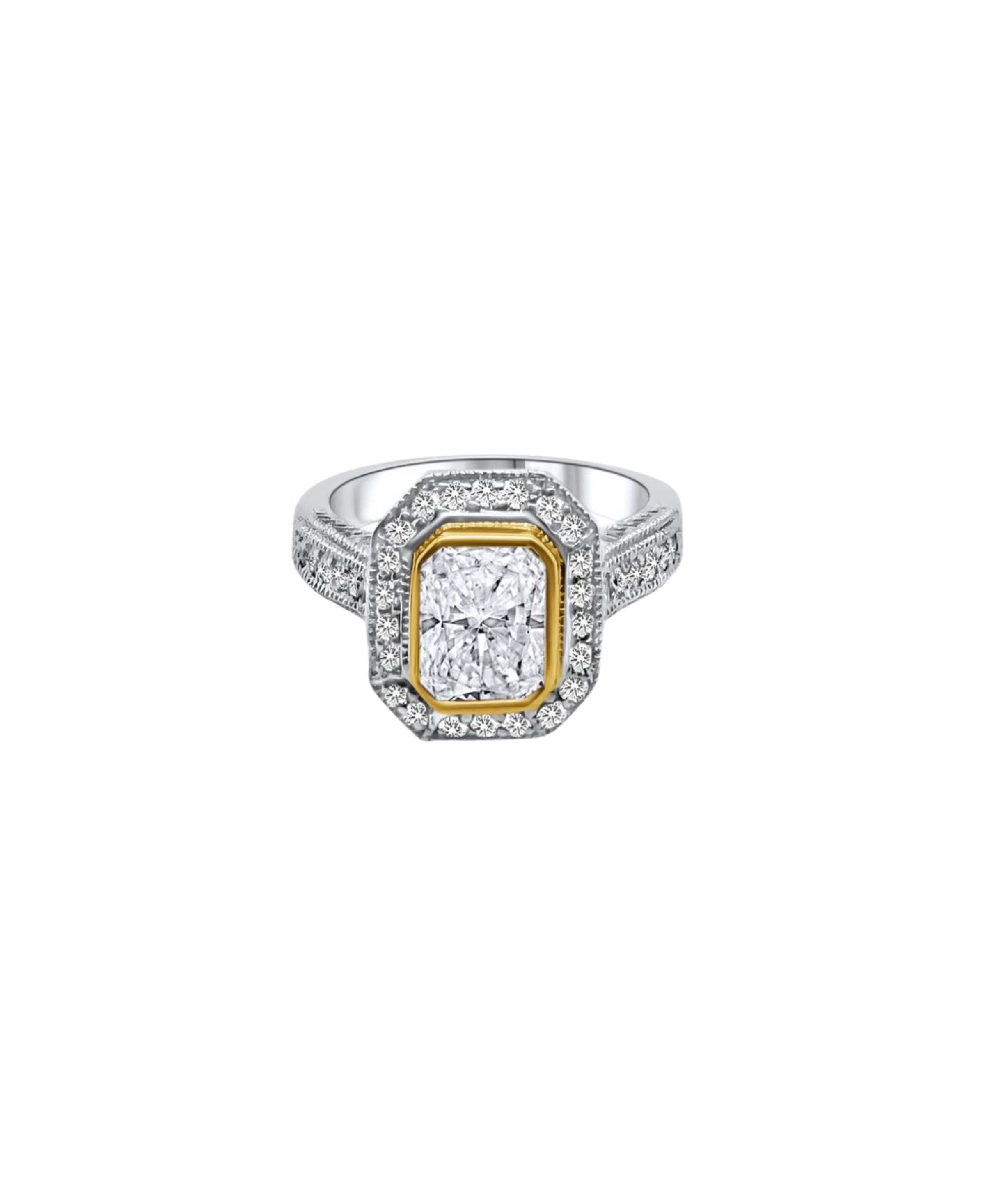 Meet the ring that doesn’t just whisper luxury—it shouts it from the rooftops. This Two-Tone Radiant Cut Diamond Halo Ring is where classic elegance meets modern flair. At its heart lies a stunning 1.01-carat radiant cut center diamond, framed by a rich yellow gold bezel that adds a bold pop of warmth. Surrounding this centerpiece is a halo of brilliant 0.55 carats of accent diamonds, extending down the intricately detailed band crafted in luminous white gold. The mix of metals creates a striking contrast, making the center diamond appear even more radiant (pun intended). Perfect for an engagement or a “just because I deserve it” moment—because honestly, why not?