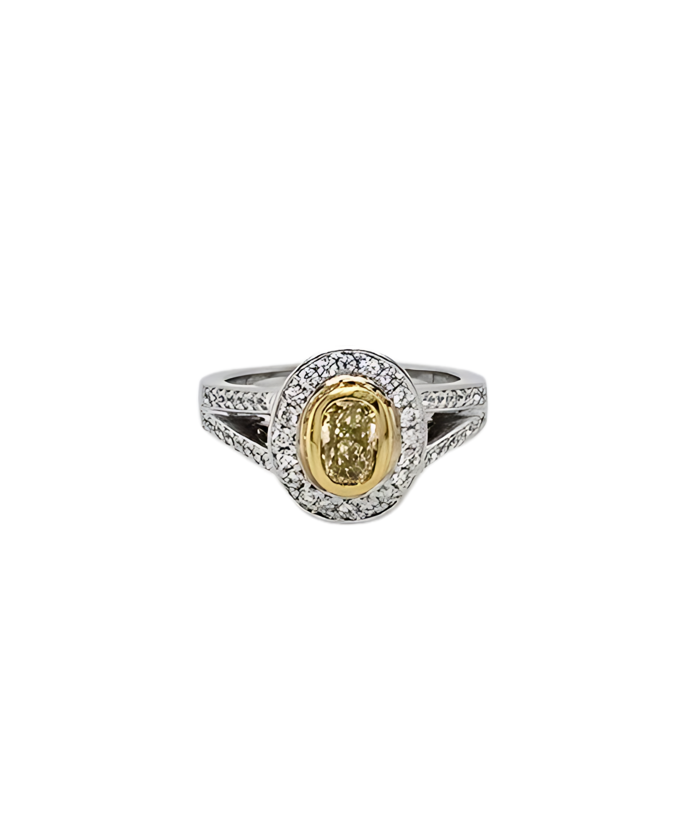 - Gemstones: Oval Yellow Diamond Center with White Diamond Halo, 1.24 CTW